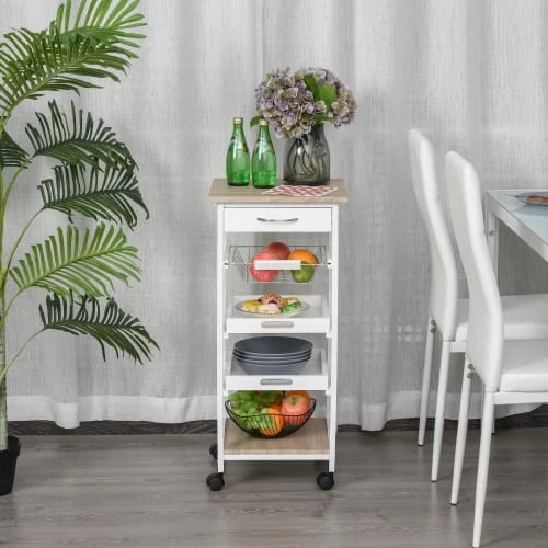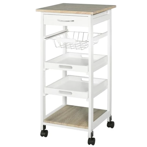 – Desserte multi-rangements : panier + 2 plateaux amovibles, tiroir, étagère + plateau supérieur/plan de travail