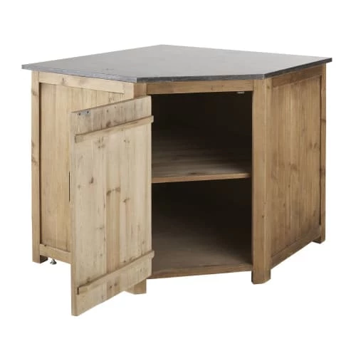 Pour une cuisine pleine de charme, misez sur le meuble bas d’angle de cuisine 1 porte en pin recyclé effet vieilli AUBAGNE. Il vous offre un beau plan de travail en pierre bleue anthracite qui vous permettra de préparer vos recettes gourmandes ou de poser vos bocaux et autres ustensiles. Parfait pour optimiser votre espace, ce meuble de cuisine possède également un beau volume de rangement avec une étagère intérieure fixe cachée derrière la porte. Complétez-le avec d’autres éléments de la gamme AUBAGNE pour un espace culinaire 100% authentique.