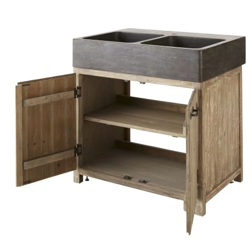 Retrouvez le charme du style maison de campagne tout en gardant le confort d’un design moderne avec le meuble bas de cuisine pour évier 2 portes en pin recyclé grisé GRETA. Doté de 2 bacs en pierre bleue aux nuances anthracite et brunes dont chaque pièce est unique, il fera sensation auprès de vos convives. Dans la partie basse, ce meuble de cuisine dispose de 2 portes avec 1 étagère pour ranger vos produits d’entretien, par exemple. Autres points forts, il est équipé de fileurs sur les côtés et de pieds ajustables pour une finition parfaite. Un sans faute !