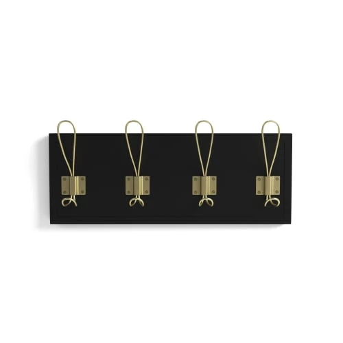 La patère Ariane est un panneau de bois rectangulaire, sur lequel sont fixés à l’aide d’appliques en métal 4 crochets métalliques. Chaque crochet est constitué de deux parties : une large boucle en haut et une plus petite en bas, afin d’y accrocher un maximum d’objets.